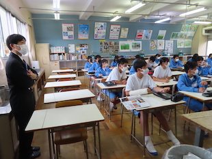 本日もいくつかの授業を参観しました。3年生の英語の授業では、ALTの先生の関係の方に授業を参観していただきました。今日は、How can I get to Fukuoka airport? のような電車の乗り換え案内などを学習していました。世の中も少しずつ海外旅行が再開されているようです。みなさんが、実際に海外で英語を駆使する日はそう遠くはないと思います。