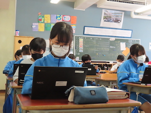 さて、そんな寒さをものともせず飯中生は元気いっぱいに学校生活を送っています。宇宙から見た地球の画像に目を輝かせたり、トマトが何科に属するのか仲間と話し合ったり、アイロンビーズの下絵をタブレットを使って熱心にさがしたりとひとりひとりが「学びたい」という気持ちに溢れています。貧欲な好奇心をもって様々な知識を吸収し、自ら「気づき」、「考え」、「行動」できる、これからの先行き不透明な時代を生き抜いていくことのできる力を身につけてほしいと思います。
