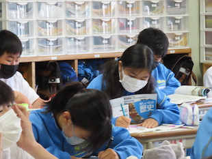 本日は、休み時間の様子と一部給食最終日の様子をお伝えします。授業のチャイムが鳴り、休み時間になるとみんな授業中とは全然違った表情を見せてくれます。次の時間の特別教室へ移動する人、友だちとのおしゃべりを楽しむ人、静かに読書を楽しむ人、次の授業の準備をする人、様々ですが、それぞれが休み時間を有効に使っています。真剣勝負の授業の合間のホッとする瞬間です。