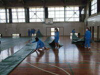 体育館では、(待機中の)3年生保護者向けに体育祭の様子が上映されました。