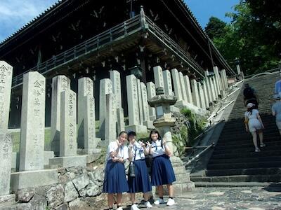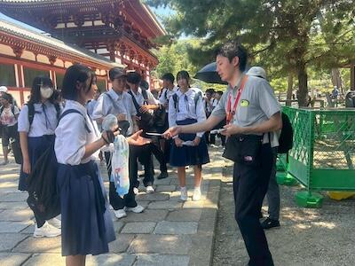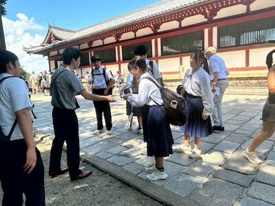 東大寺南大門横で集合写真を撮影した後、班別行動チェックです。チケットを受け取って東大寺に入ります。