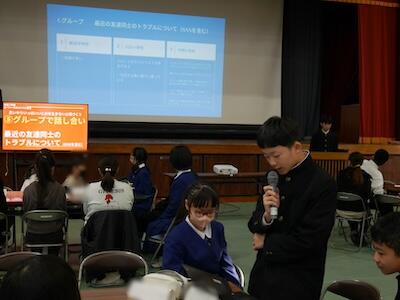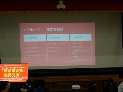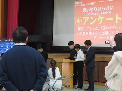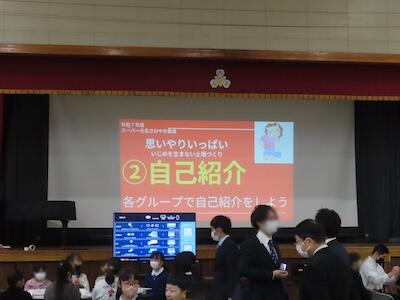 本日は、本校を会場に川辺小学校、中野小学校の代表児童とともにスーパー元気さわやか集会が行われました。同時に学校運営協議会が開かれ、活動報告の後、スーパー元気の様子を参観していただきました。スーパー元気さわやか集会は、みなが安心で元気な学校生活を送れるよう、いじめを許さない土壌づくりをおこなうために、意見交換をおこなう会です。最初にアイスブレイクを行い、緊張がほぐれたところで意見交換を開始しました。みんなが活発に意見を交換し、最後には飯沼議定書の提案を行いました。とても有意義な時間となりました。終了後、学校運営協議会の皆様に本日の集会の感想をいただきました。本日お越しいただきました皆様、ありがとうございました。