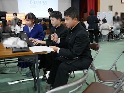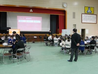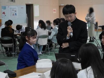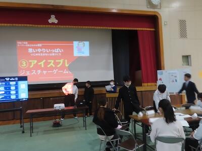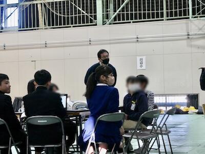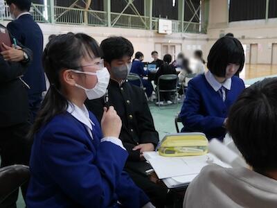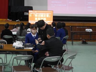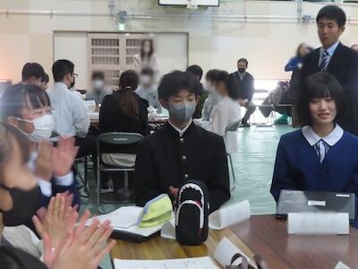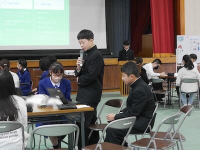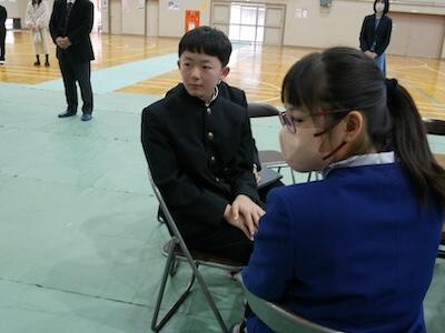 本日の午後は、来年度本校に入学する児童と保護者の方々をお招きし、新入生説明会を行いました。校長あいさつ、生徒会長あいさつの後、有志による校歌の披露、そして生徒会本部による飯中の1年を寸劇や飯中ソーランなどを交えながら紹介しました。その後は、来年度から変更になる新しい制服のお披露目をしました。前半は、児童・保護者に聞いていただき、後半は児童は教室で活動をしました。教室では、川辺、中野、桜川の生徒が一緒になってコミュニケーション活動を行いました。入学前にお互いを知ることができるよいチャンスになったと思います。もう新しいお友達ができた人もいたのではないでしょうか。4月にみなさんが入学するのを楽しみにしています。