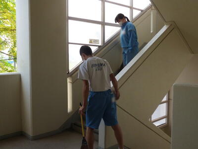 出席確認が終わると清掃です。今日は校舎内を回りましたが、全員が一所懸命に清掃に取り組んでいました。丁寧な床の清掃は心も美しくなる気がします。自分たちが学ぶ場所を清め、1日が始まります。