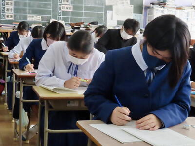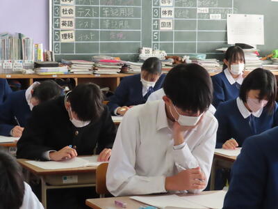 本日は、1·2年生の期末テスト2日目でした。テストに向かう姿勢は、どの生徒も真剣そのものでした。今日までの学習の成果が発揮できるといいですね。来週にはテストが返されると思いますが、必ず解き直しをして、できなかった問題を克服しておいてください。3年生は今、受験に向けて必死です。来たるその日のために1·2年生もしっかりと学習したことを身につけておきましょう。