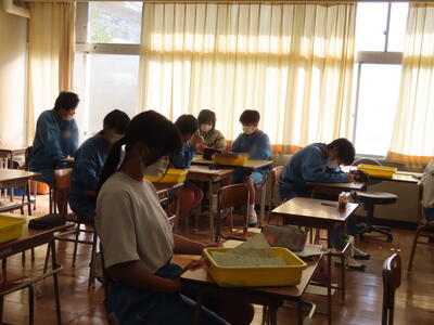 1·2年生は、テストが来週ですので、本日も通常授業を行っています。英語の授業では、byの省略、by以外の前置詞をとる受動態を学習していました。身近な事象を例に挙げての説明はとても分かりやすいです。国語ではグループでカードになった文章を意味を読み取りながら並べ替える文章整序をしていました。ゲーム感覚で読解力をつけていきます。1年生の数学では、いつも通りリトル·ティーチャーが活躍しています。早く問題を解くことができた生徒がリトル·ティーチャーとなり仲間にアドバイスをします。教え合い学び合いを生かしています。そして保健体育の授業で腰にタオルを巻いた一風変わったスタイルは、相撲の授業です。先日の剣道同様、日本の武道について学んでいきます。美術では、立体制作物の着色が佳境に入っています。飯中ギャラリーで作品を紹介するのもそう遠くはなさそうです。今日も飯中生は元気に活動しています!