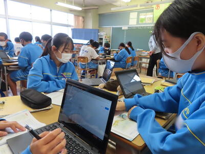 「緊張してますか?」と尋ねると「少し。。」と答えていた生徒ですが、授業が始まると積極的に意見を交換していました。グループで議論をし、共有した意見を発表しました。そして、その意見を全体で質問したりしながら、共有をしました。それぞれが、自分の考えだけでなく、他の人の考えを聞くことで、新たな視点や発見があったことと思います。おいでいただいた先生方、ありがとうございました。