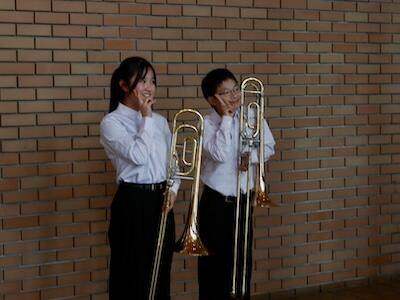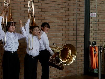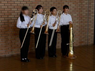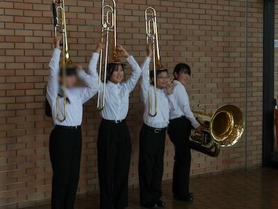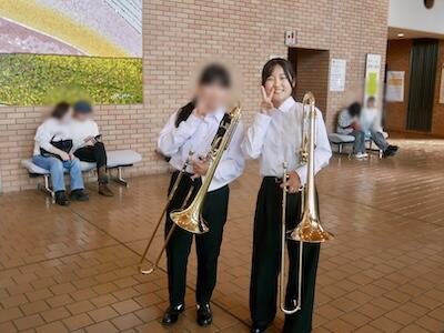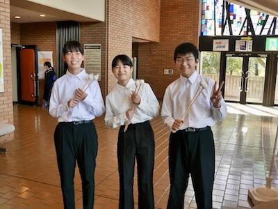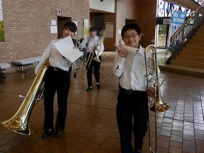 県民の日の本日は、羽生市産業文化ホールにて埼玉県アンサンブルコンテスト東部地区大会が開かれました。本校からも2組が出場しました。演奏曲は、1組目、「マリンバ三重奏 雅~3人のマリンバ奏者のための」、2組目、「金管四重奏 薫風」でした。2組ともこの日のために懸命に練習を重ねてきました。校長室の上が音楽室ですので、私も毎日マリンバの奏でる音を聞いていました。今日の演奏も練習の成果を十分に発揮するものでした。とてもよくがんばりました。(ホール内は撮影禁止ですので、演奏後の様子をお伝えします。)
