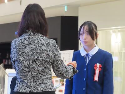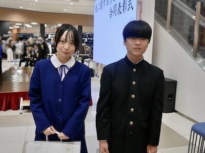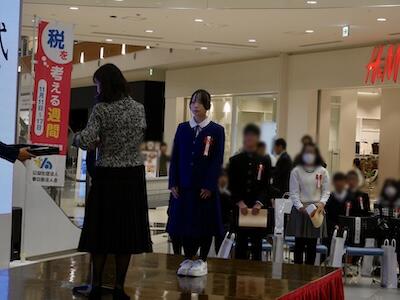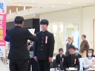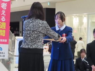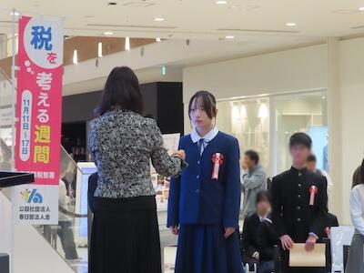 本日は、イオンモール春日部において税に関する合同表彰式が行われました。本校の生徒からも2名が表彰を受けました。2名はそれぞれ「埼玉県間連会長賞」と「春日部税務署長賞」を受賞しました。多数の応募の中からの受賞、とても立派です。