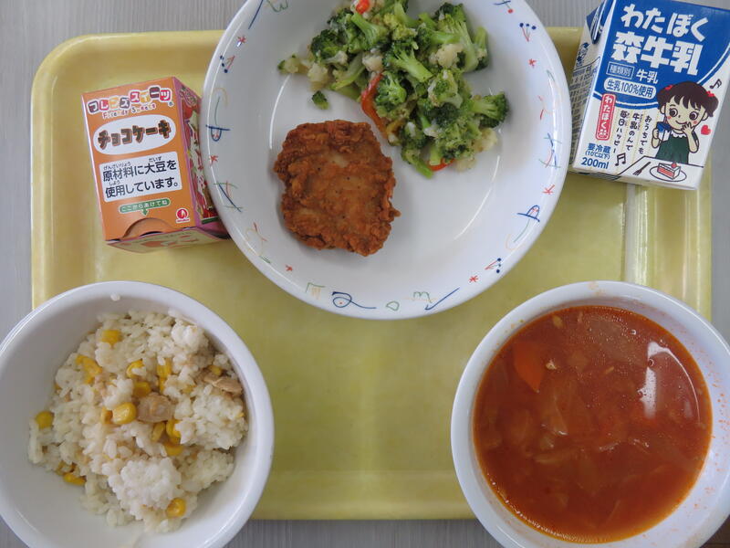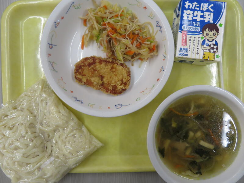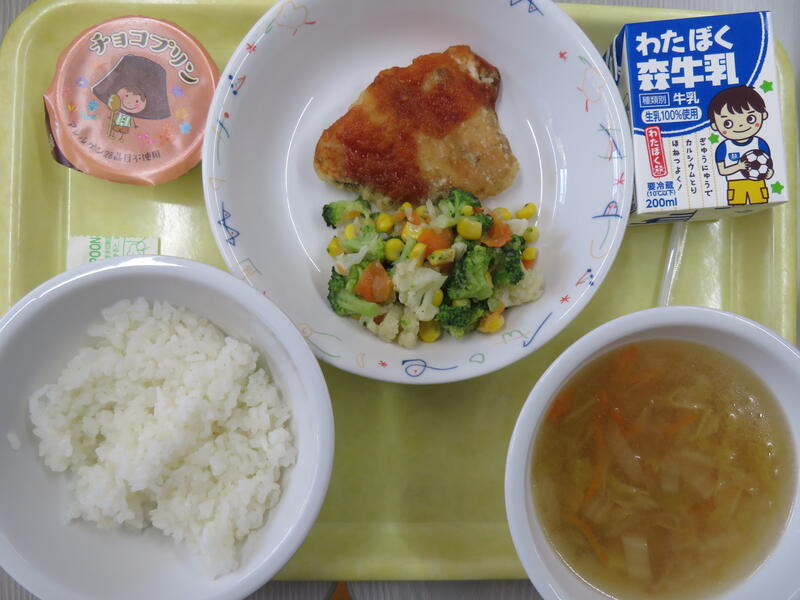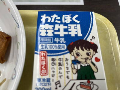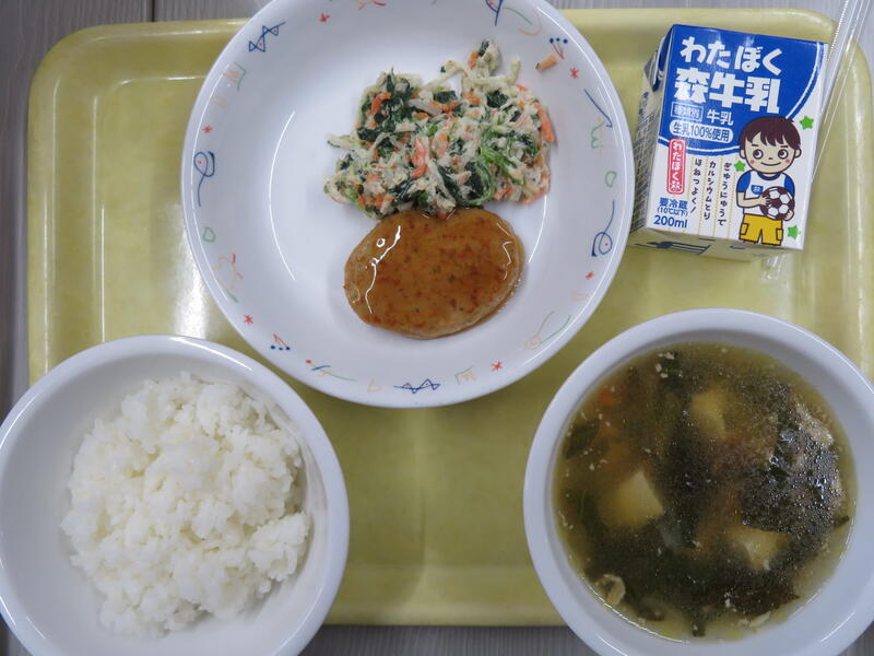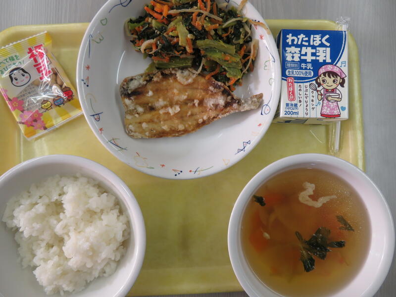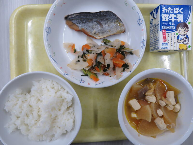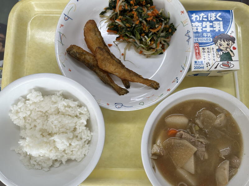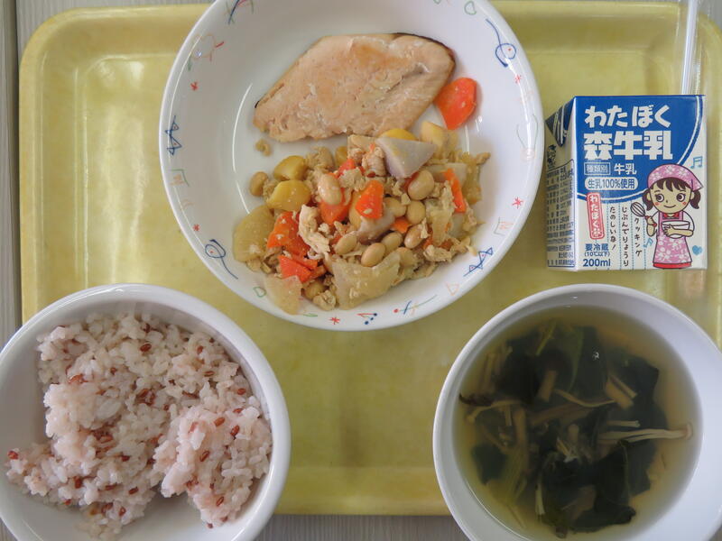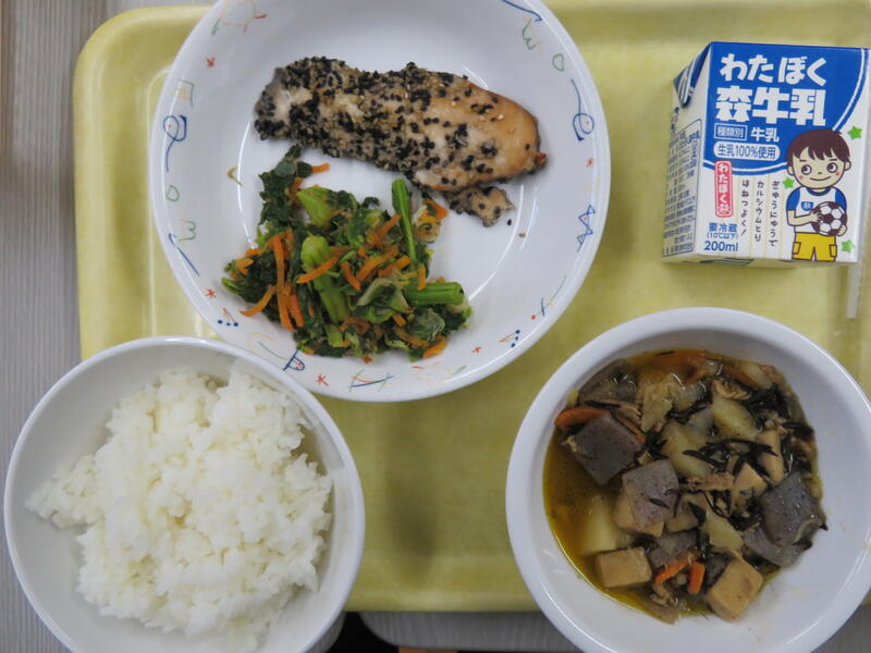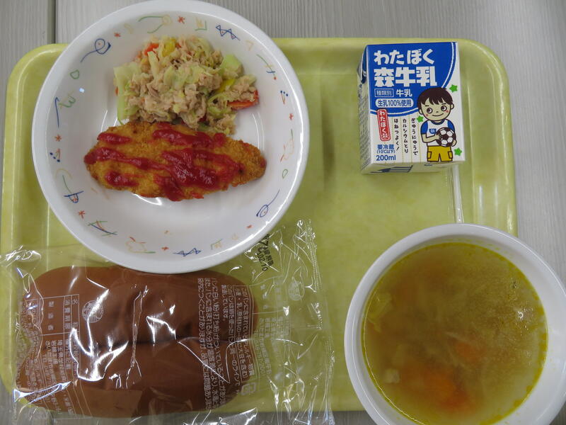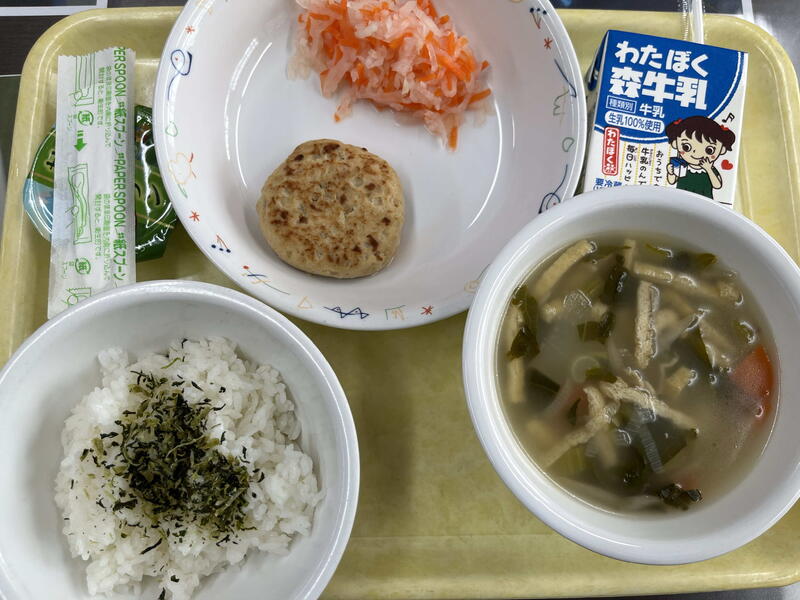 ごはん、牛乳、レバーカツ、和風スープ、根菜の炒め煮
