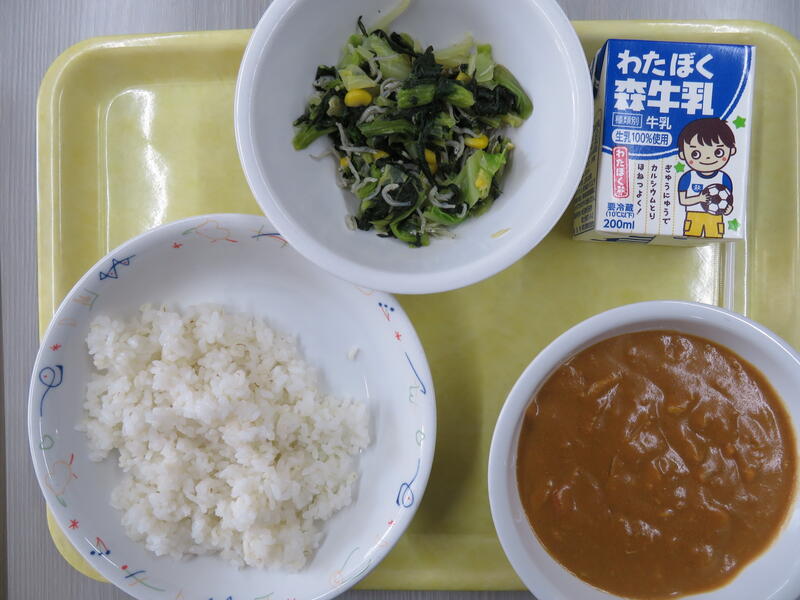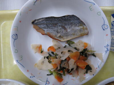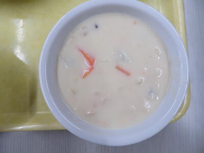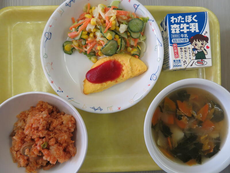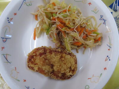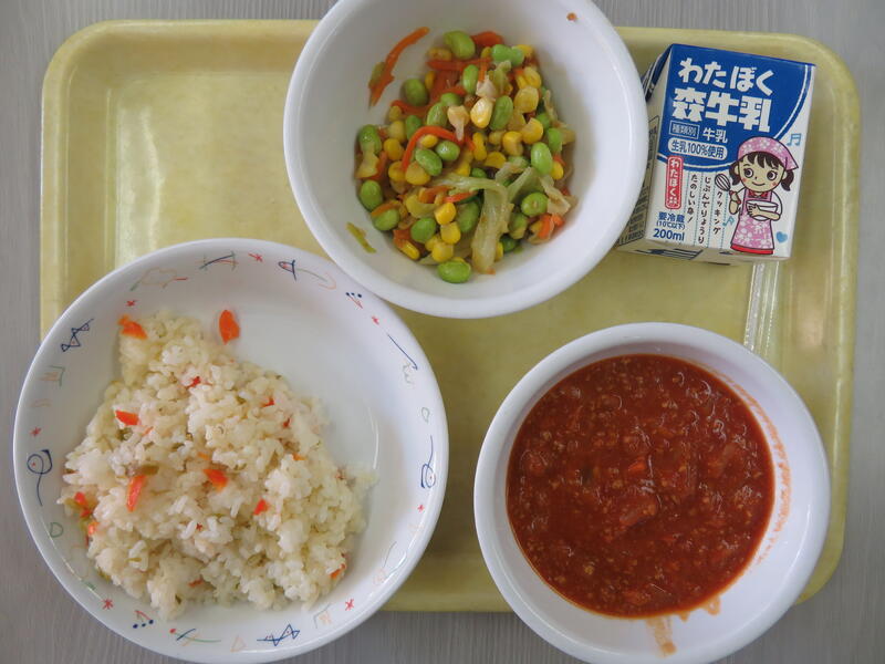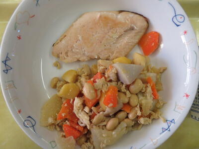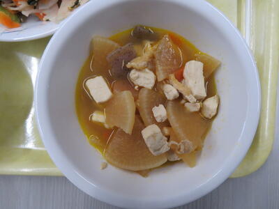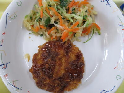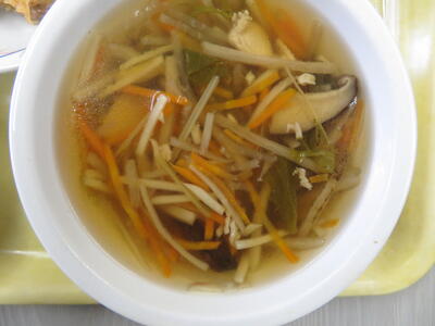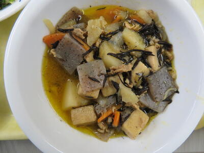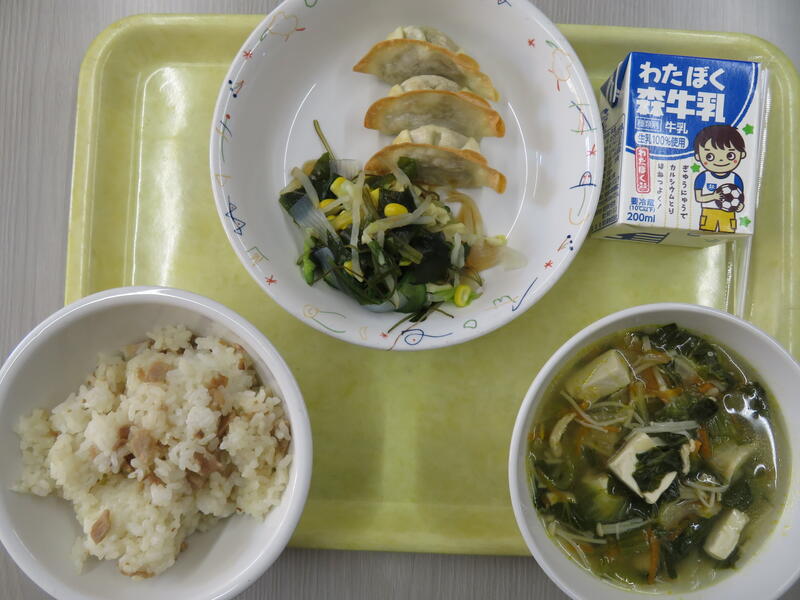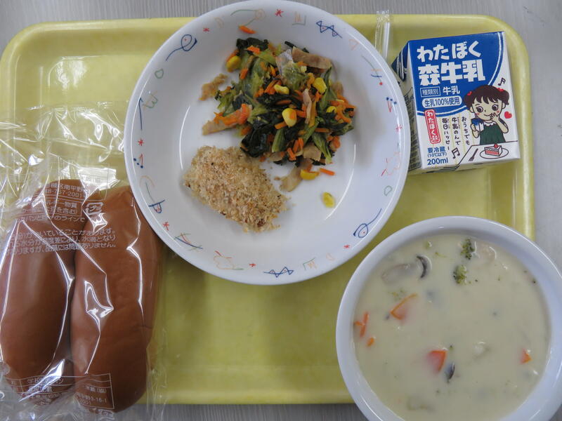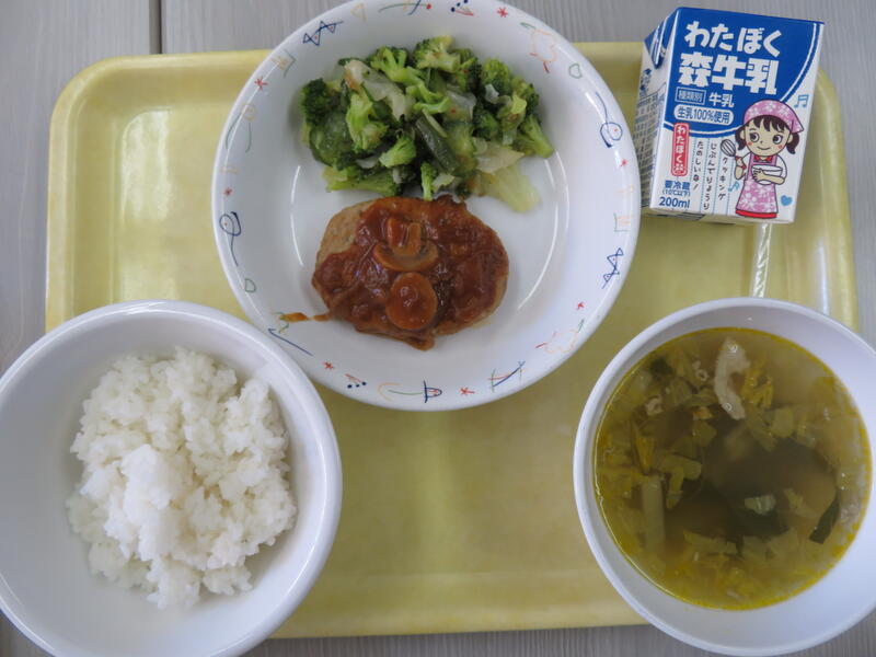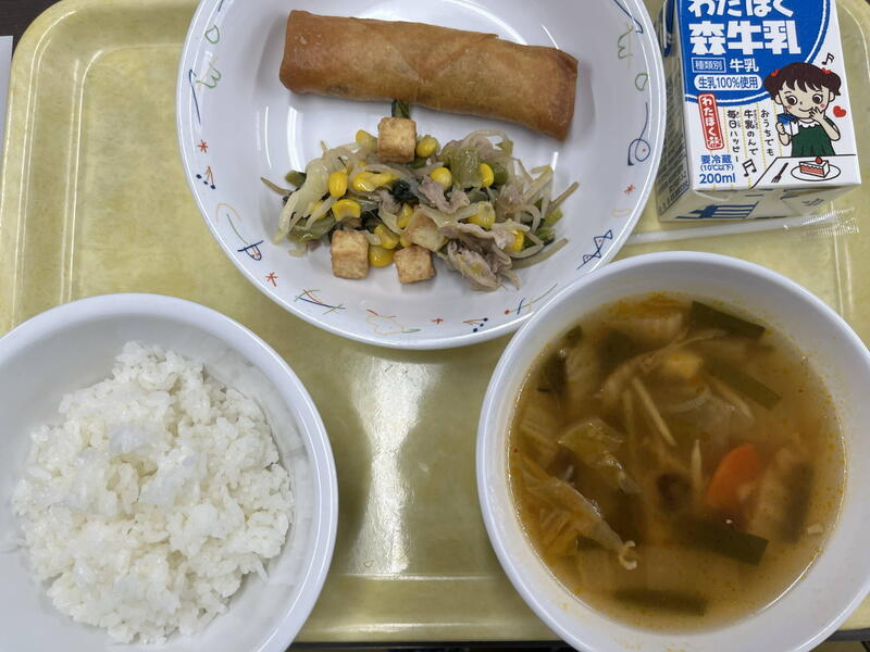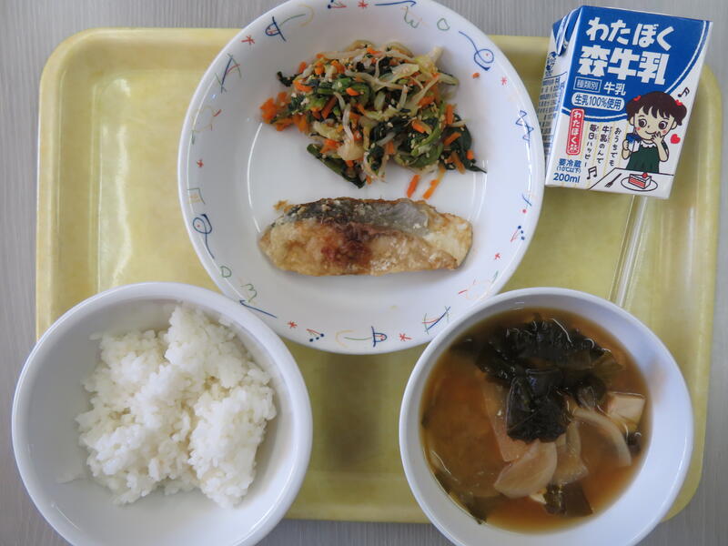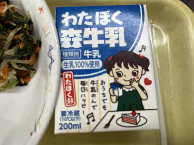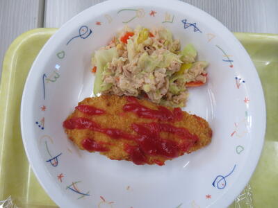 ごはん、牛乳、レバーカツ、和風スープ、根菜の炒め煮