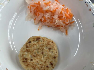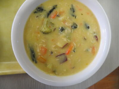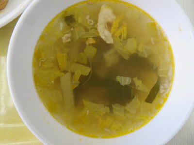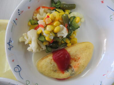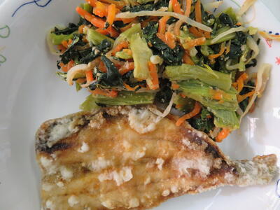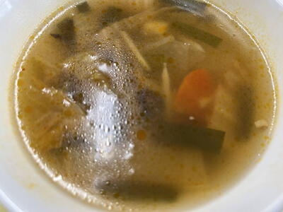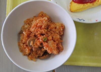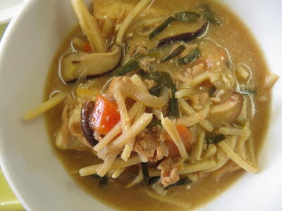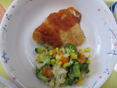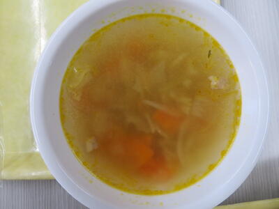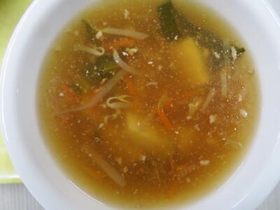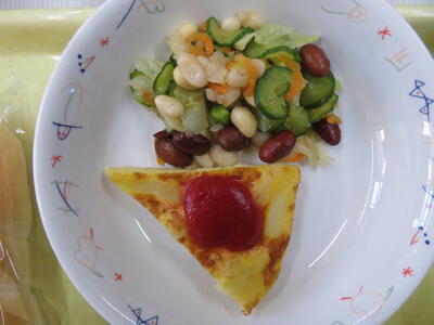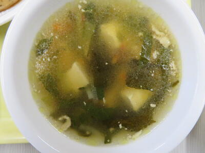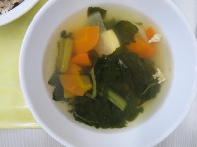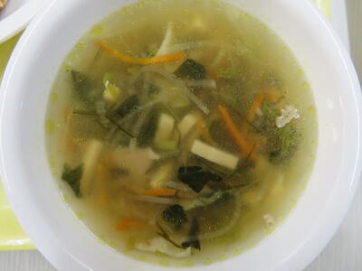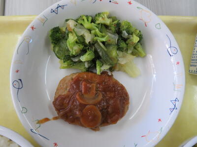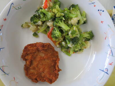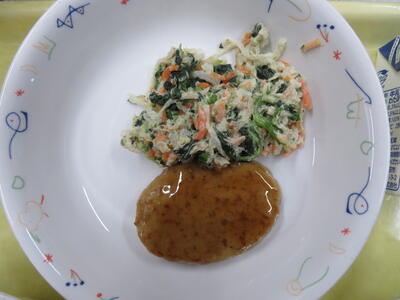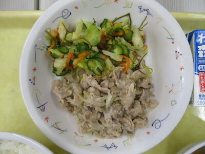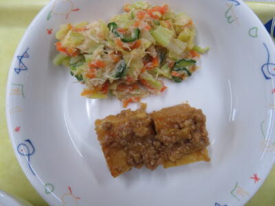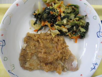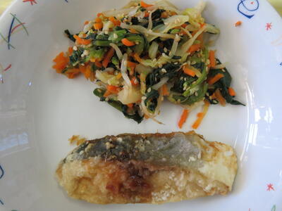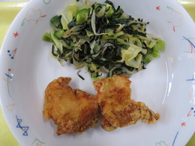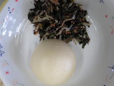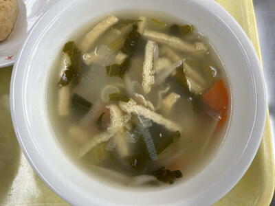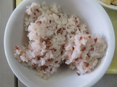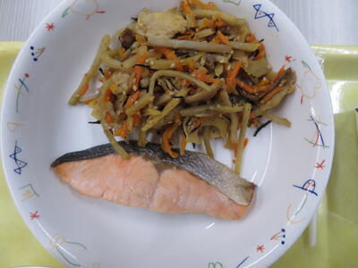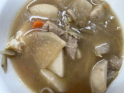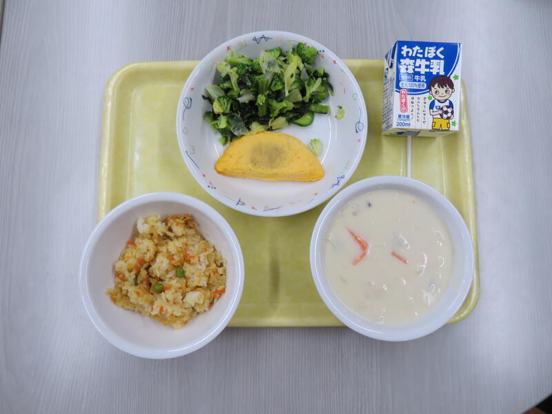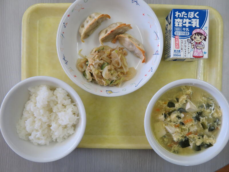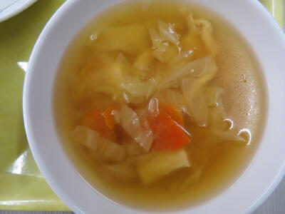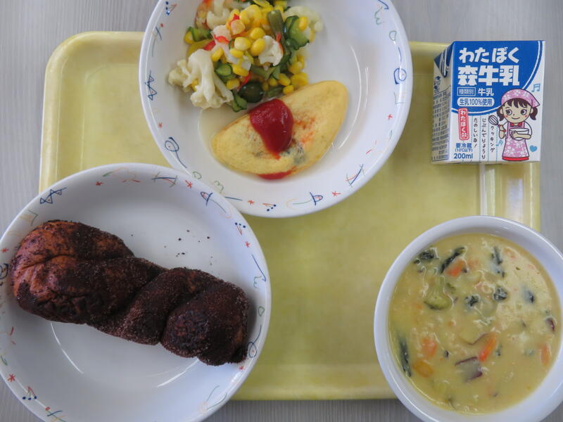 ごはん、牛乳、レバーカツ、和風スープ、根菜の炒め煮