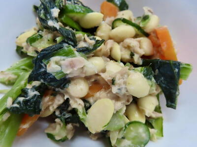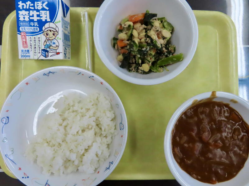 むぎごはん、牛乳、ハヤシライス、ビーンズサラダ