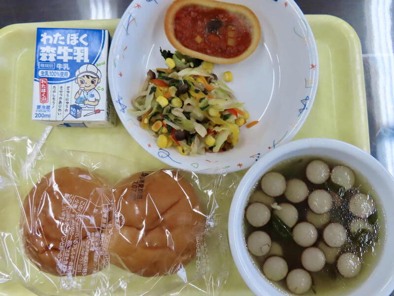 はちみつパン、牛乳、なすとポテトのミートグラタン、彩りサラダ