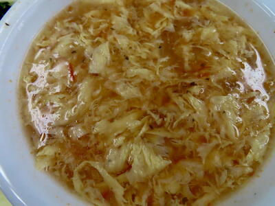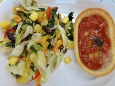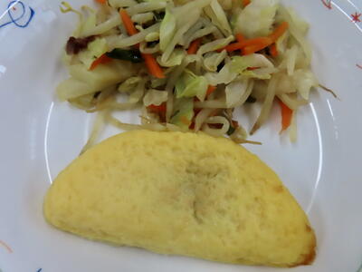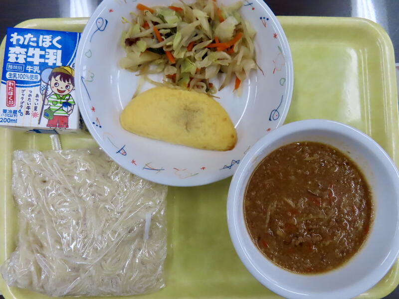 ホット中華麺、牛乳、ジャージャー麺、トマトオムレツ、キャベツと海藻の土佐和え