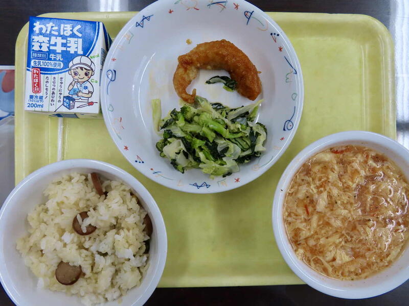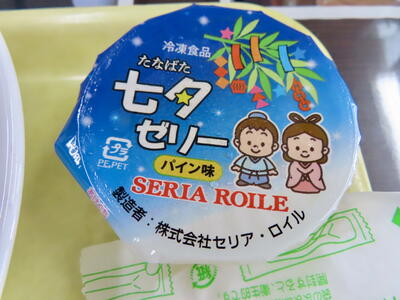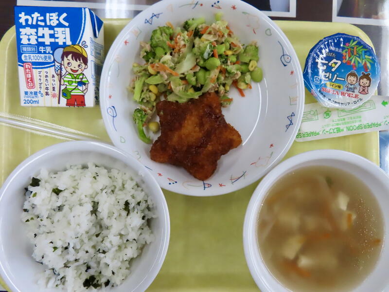 わかめごはん、牛乳、星形コロッケ、ツナと枝豆サラダ、七夕汁、七夕ゼリー