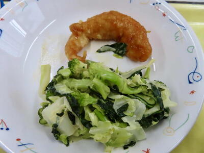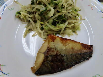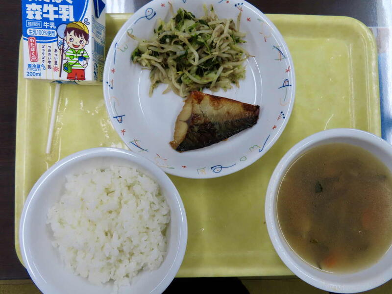 ごはん、牛乳、さばのカレー風味、青菜のおかか和え、肉団子汁