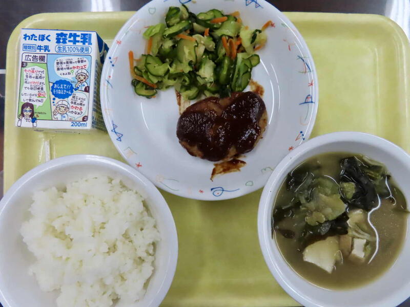 ごはん、牛乳、ハンバーグプルーンソース、ナスの味噌汁、野菜のごましょうゆ和え