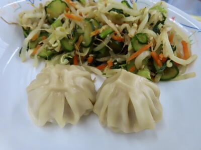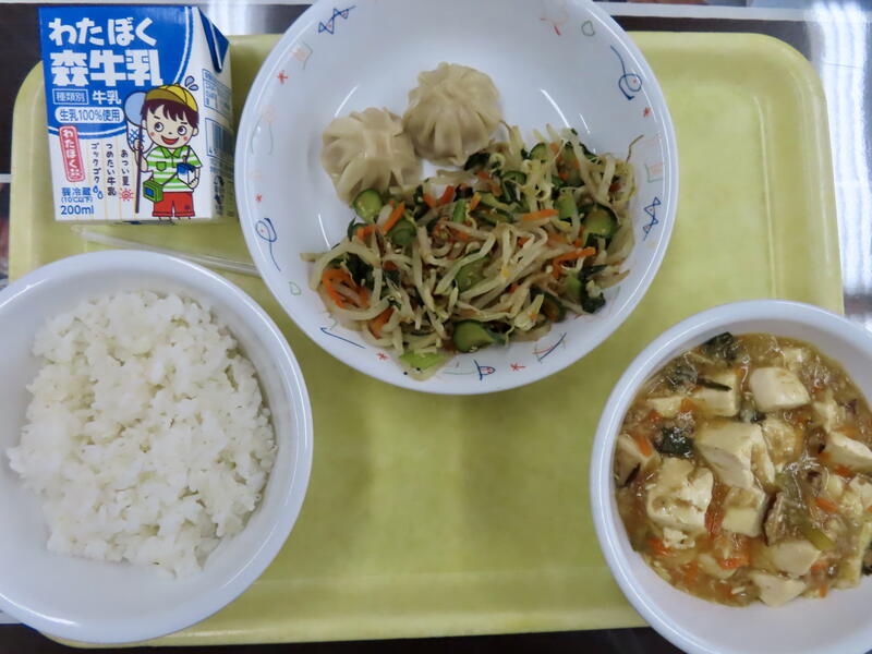 麦ごはん、牛乳、マーボー豆腐、里芋パオズ、もやしのゴマ風味