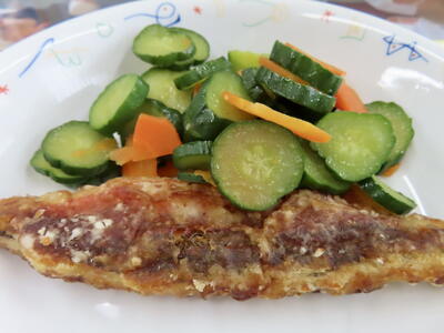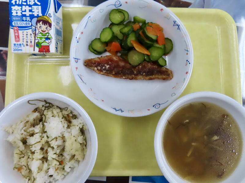クファジューシー、牛乳、グルクンの竜田揚げ、もずくスープ、コロコロきゅうり
