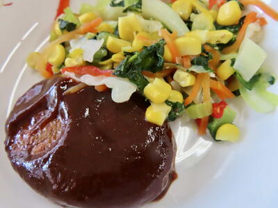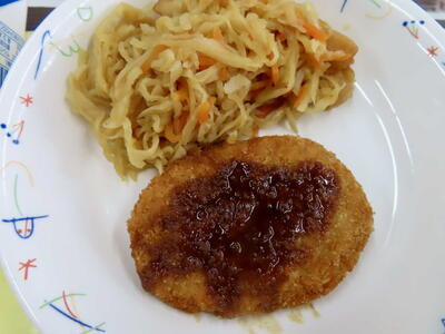 ごはん、牛乳、ハンバーグプルーンソース、夏野菜のスープ、カラフルサラダ(クリーミーごまドレッシング)
