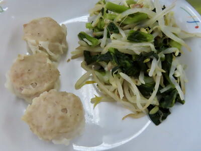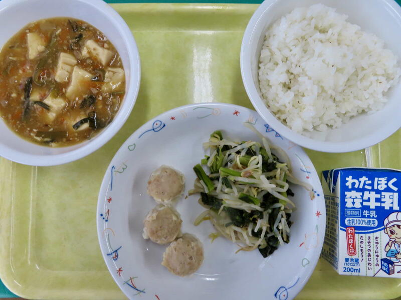 麦ごはん、牛乳、マーボー豆腐、しゅうまい、もやしの中華和え
