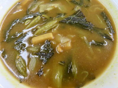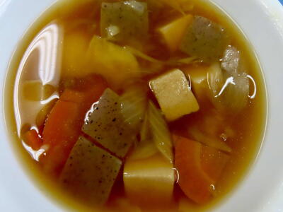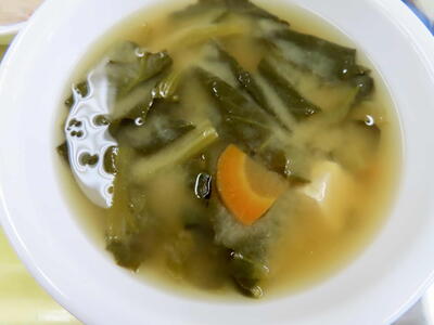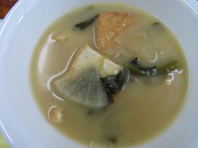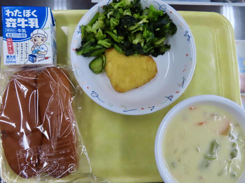 地粉うどん、牛乳、カレー南蛮、おにまん、磯香和え、お祝いクレープ(開校記念日[明日])