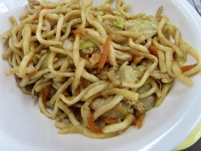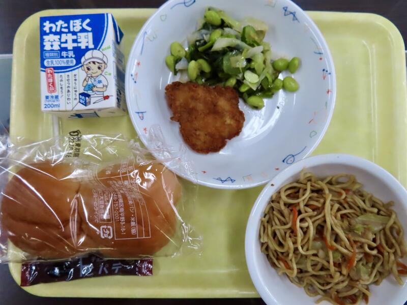 こどもパン、牛乳、チョコクリーム、やきそば、クリスピーチキン、えだまめサラダ(野菜いっぱいドレッシング)