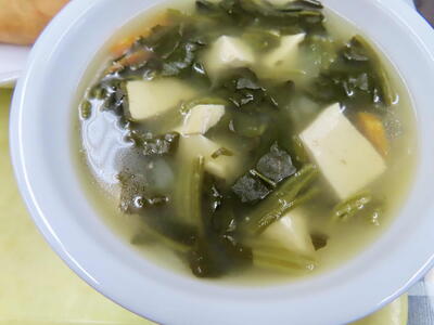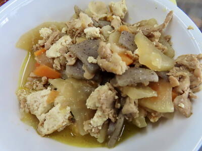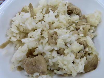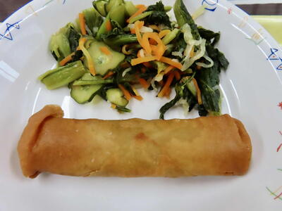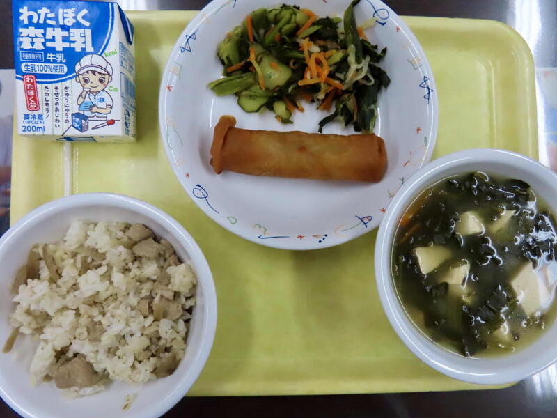 とりごぼうごはん、牛乳、春巻き、豆腐スープ、華風和え