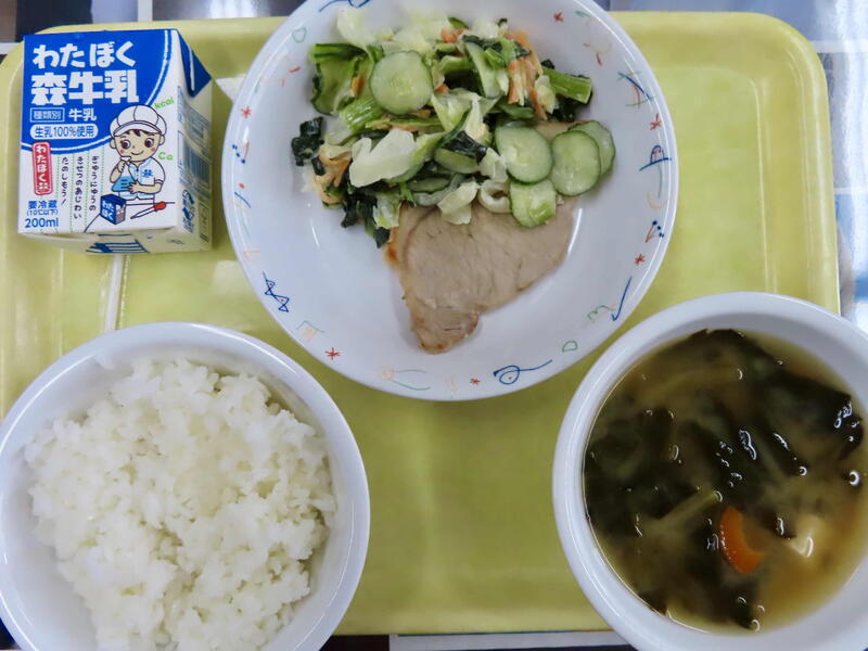ごはん、牛乳、豚肉の生姜焼き、みそ汁、コールスローサラダ