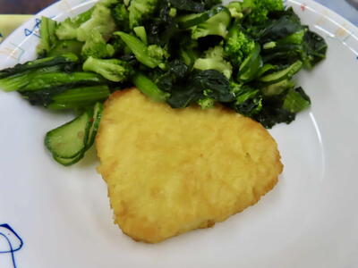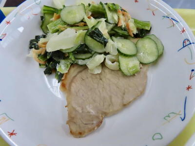 黒パン、牛乳、アスパラガスのシチュー、チキンピカタ、グリーンサラダ(玉ねぎドレッシング)