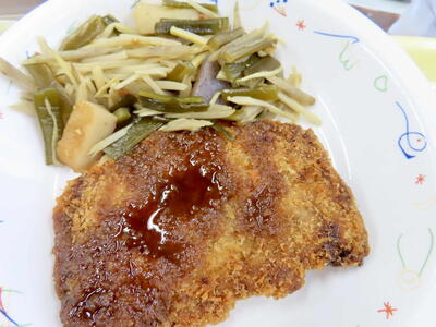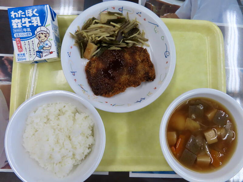 ごはん、牛乳、豚レバーカツ、じゃがいもの煮物、茎わかめの炒め物