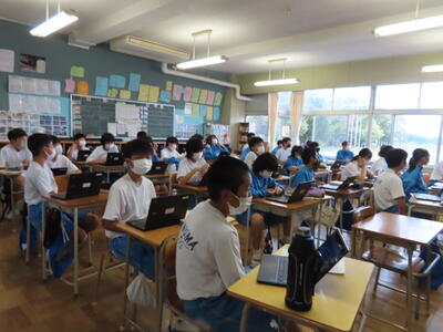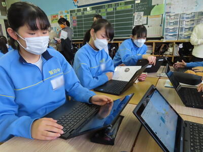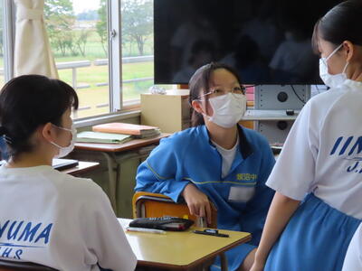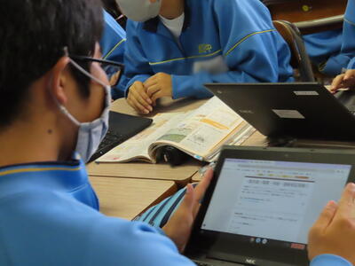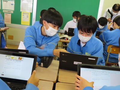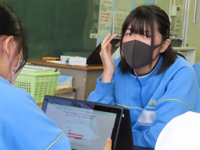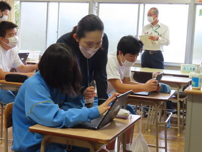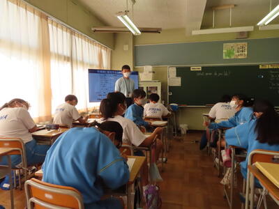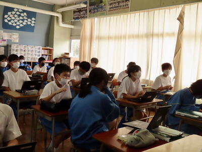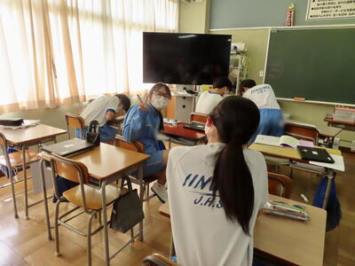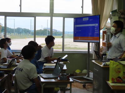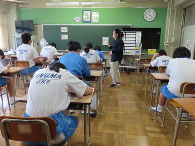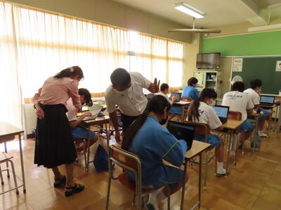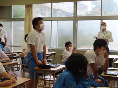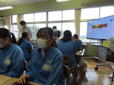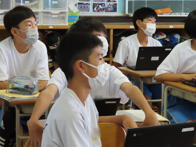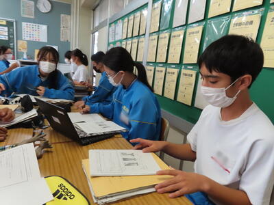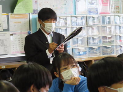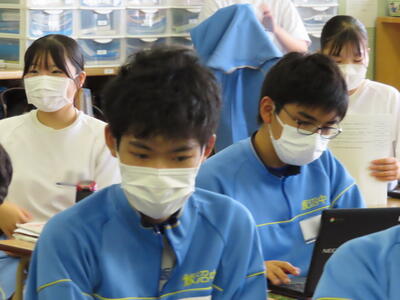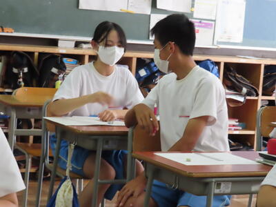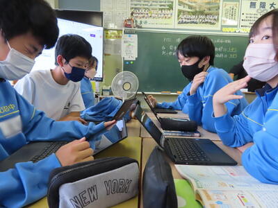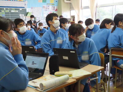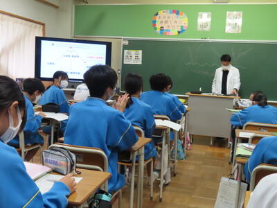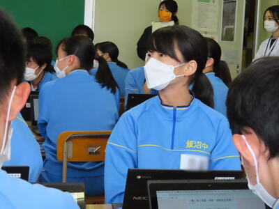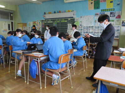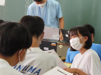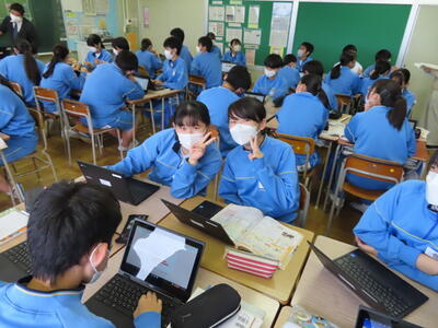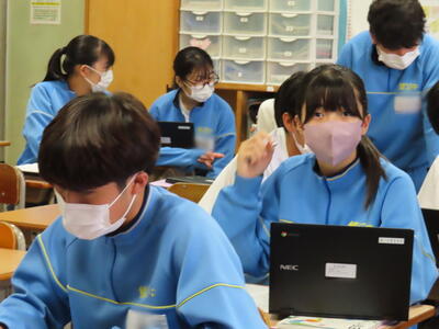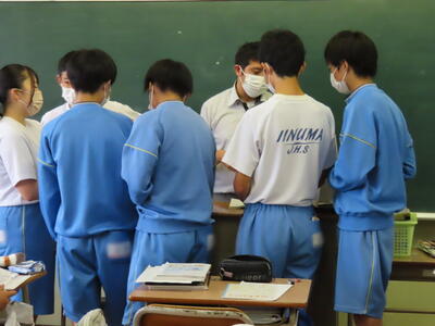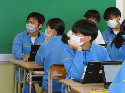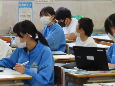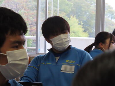 「緊張してますか?」と尋ねると「少し。。」と答えていた生徒ですが、授業が始まると積極的に意見を交換していました。グループで議論をし、共有した意見を発表しました。そして、その意見を全体で質問したりしながら、共有をしました。それぞれが、自分の考えだけでなく、他の人の考えを聞くことで、新たな視点や発見があったことと思います。おいでいただいた先生方、ありがとうございました。