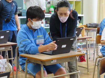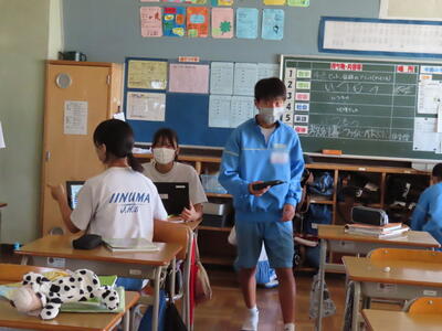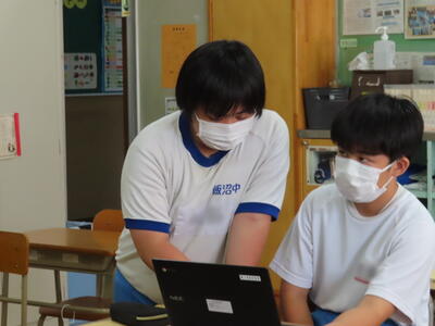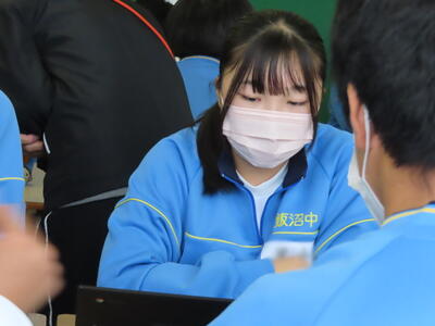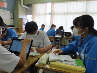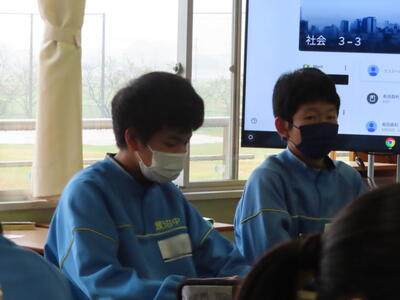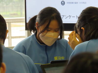 本日は、春日部市教育委員会の先生が本校の授業を見に来てくださいました。本日は社会の授業で、需要と供給、価格の関係についてでした。生徒たちは、タブレット端末を活用し、話し合いの結果をまとめていました。それぞれが自分の考えをタブレットに記入し、それをもとに話し合い、1枚の発表シートを作り上げるという活動でした。生徒たちは、相手の話に耳を傾け、熱心に話し合いをしていました。