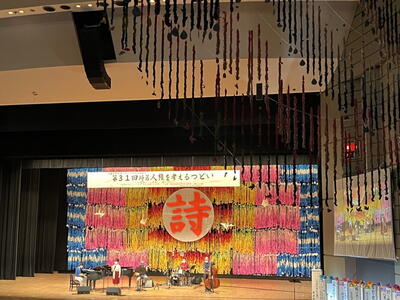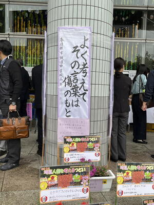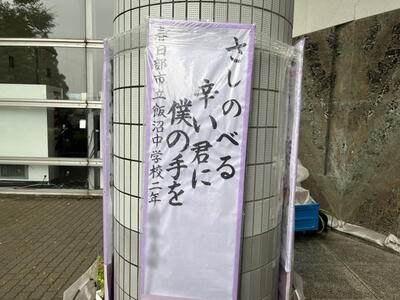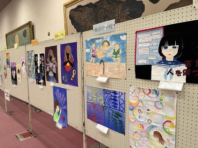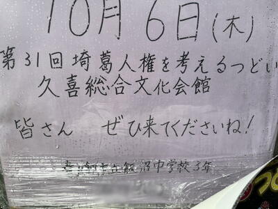 本日は、久喜総合文化会館にて行われた第31回埼葛人権を考えるつどいに参加をしました。敷地入口から会場までの通路、会場内のホールなどに埼葛地区の小中学生が作成した人権に関する制作物が飾られていました。もちろん本校の生徒の作品も飾られていました。かなりの量が飾られていたので、全てを見つけ出すことはできませんでしたが、私が発見できた本校の作品をご紹介します。
