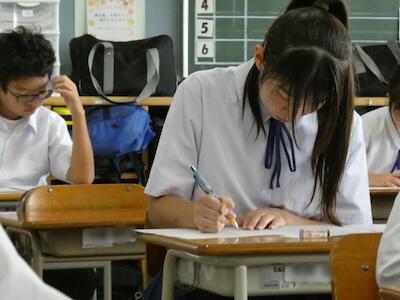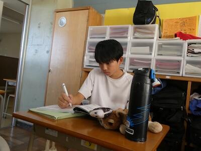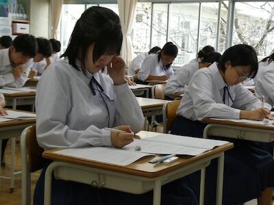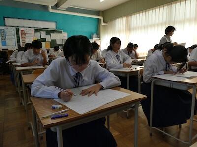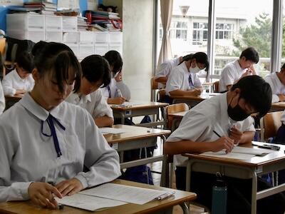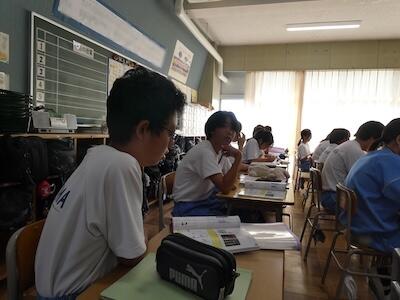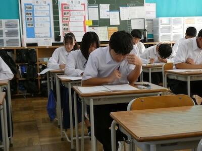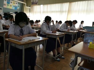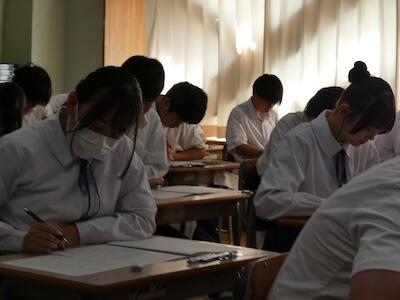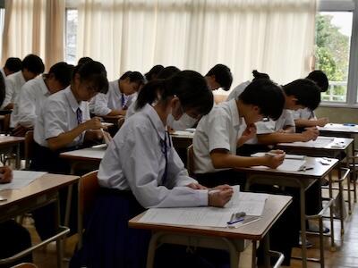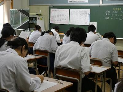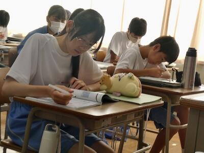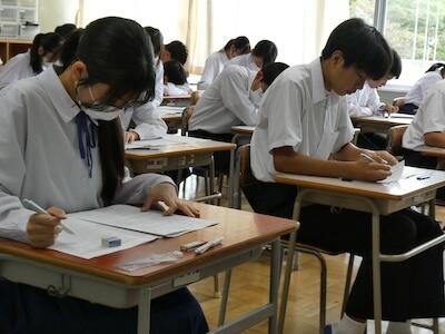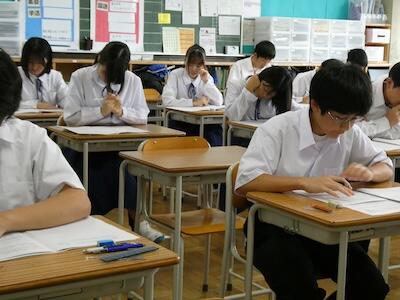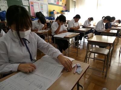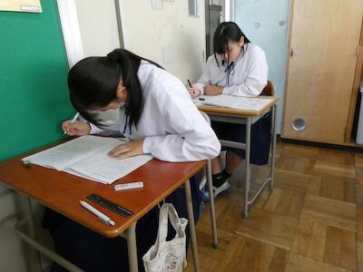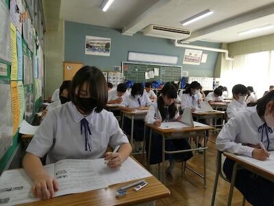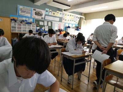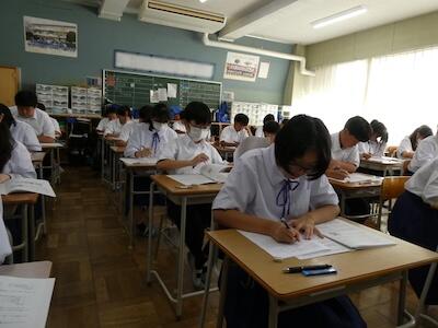本日は中間テストの2日目です。今日も真剣表情があちらこちらで見られます。今日のテストが終われば部活動再開です。がんばりましょう!