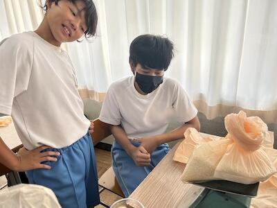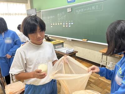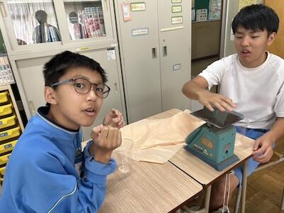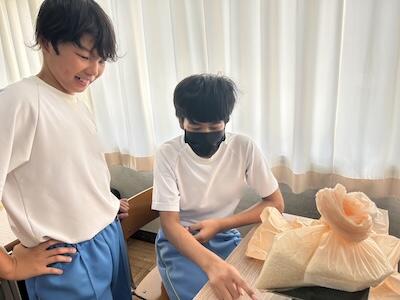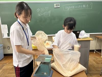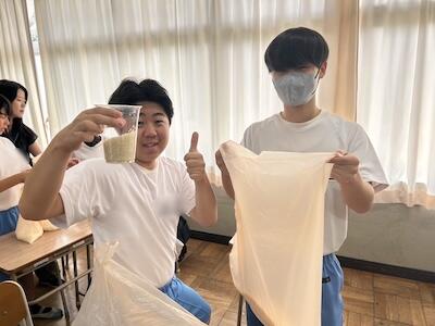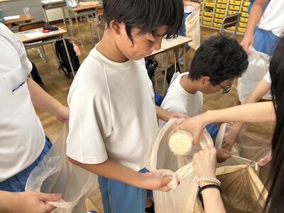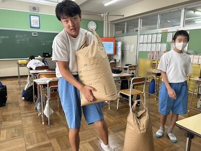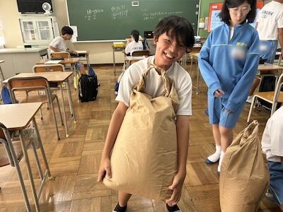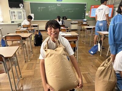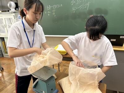 先日、収穫体験をさせていただいた飯沼区長様から、しらさぎ学級の生徒にお米をいただきました。(しかも収穫したお米より良いお米をです!)しらさぎ学級の生徒は、計量の学習も兼ねて、いただいたお米を秤で計量しながら袋に小分けしていきました。おいしいおにぎりを食べる想像でもしていたのでしょうか、とても良い笑顔をしていました。田植え体験から収穫体験までお世話になり、お米までいただき、飯沼区長様、本当にありがとうございました。