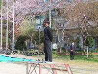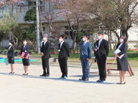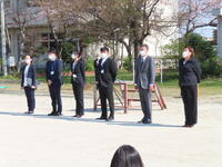 始業式は、感染症防止対策のため、校庭で行われました。この日は、暖かな春の日差しで、校庭での始業式もよいものだと感じました。校長の話と職員紹介がありましたが、生徒たちは非常にしっかりとした態度を話を聞くことができました。
