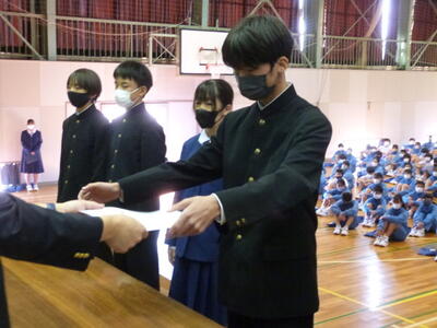 そして新旧会長のあいさつ、旧役員への感謝の花束贈呈、旧役員のあいさつがありました。新しい生徒会のスタートです。みんなで盛り立てて、飯中をますます良い学校にしていきましょう!