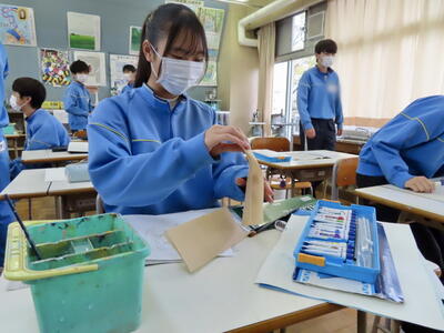 本日は、授業の様子をお伝えします。本日も職員の工夫による様々な授業が行われています。美術の授業では、2年生が自分の頭の中で空想していることを表すという制作活動を行なっていました。それぞれが、ペイントや新聞の切り貼りなど創意工夫を凝らしていました。5·6組は、様々な物を用いて立体を作り投影された影を鑑賞するという活動をしていました。保健体育では、2組に分かれ剣道とダンスを行なっていました。武道と現代的なダンス、両者のコントラストが印象的でした。理科の授業では、先日の回路図から発展して実際に豆電球を使って電流の流れを実験していました。また家庭科の授業では、衣食住の衣について学習しており、体の発汗について手にビニール袋をかぶせて実験をしていました。多くの職員が学習効果を最大限に上げるため、様々な工夫をして授業を行っています。期末テストもあと少しで始まります。今日も飯中生は熱心に学習に取り組んでいます!