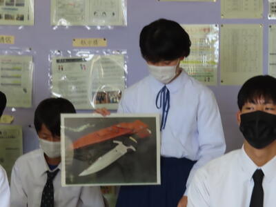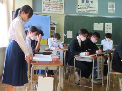 本日は社会科の魅力をお伝えします。1年生の本日の社会の授業はテストの返却、答え合わせだったので、普段の授業の様子はお伝えできないのですが、返却された解答用紙を見て満足そうに頷く生徒、間違えた問題の模範解答を真剣に読む生徒、さまざまでしたが、概ねみんなが納得のいく得点だったようです。2年生は、ペリーの来港について、その目的、どうやって日本を説得したか、その後の日本はどう変わったかを資料を紐解きながら、グループで意見を出し合い、答えをまとめる活動をしていました。先生が対話の中からヒントを出し、生徒の気づきを待つ授業で、見ている私も楽しく参加しました。3年生は、模擬裁判を行なっていました。裁判官、裁判員、検察、弁護士、被告人など役割を決め、本物のように真剣に模擬裁判を行なっていました。照れたりふざけたりする生徒などひとりもいなく、真剣に取り組む姿に3年生の底力を感じます。飯沼中は、こうして社会に限らずどの教科も工夫をし、生徒主体の授業を展開しています。(*ディスプレイの被告、証人等の名前は仮名です。)