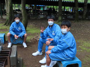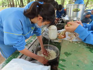 いよいよ野外炊飯、カレーづくりが始まりました。火起こしがなかなかできずに苦労していた班もありましたが、そこは「へこたれない」精神でがんばりました。最後には、全ての班が火起こしに成功しました。他にもお米を研ぐ人、野菜を切る人など、それぞれが責任を持って自分の仕事をしています。