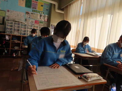 本日は、各学年の学活の様子をお伝えします。3年生は、22日に控えた県公立高校入試の志願書の書き方の説明を聞き、下書きをしていました。私立高校の入試もほぼ全てが終了し、あとは県立を残すのみとなりました。大切な願書、みんな丁寧に記入をしていました。