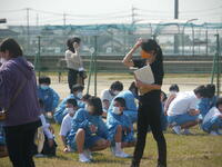 地震の速報が入ると生徒は一斉に机の下に隠れ「サルのポーズ(机の脚を斜めに持ち、両ひざを地面につける姿勢)」で揺れがおさまるのを待ちました。そして、避難指示と共に校庭に避難を開始しました。避難中、私語などなく、全員が真剣に避難をすることができました。
