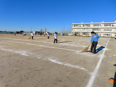 本日は、一部の部活動を除き、外部活動の最後の日でした。1年間お世話になったグラウンドを掃き清めた後、塩化カルシウム(にがり)を撒きました。グラウンドが凍結(霜柱)してしまい、土のひび割れなどが起きてしまうのを防止します。野球部と陸上競技部が飯沼中の広いグラウンドいっぱいに塩化カルシウムを撒いてくれました。これで年明けの寒い日も良好なコンディションで部活動を行うことができます。ありがとうございました。