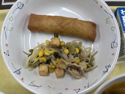 ごはん、牛乳、チゲ鍋汁、春巻き、野菜の中華味噌炒め
