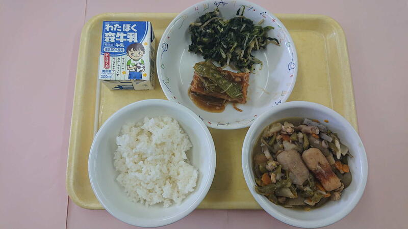 ごはん、牛乳、筑前煮、厚揚の野菜あんかけ、磯香和え、刻みのり