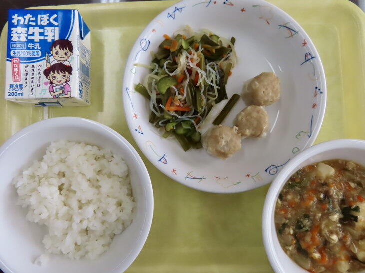 麦ごはん、牛乳、蒸ししゅうまい、マーボー豆腐、茎わかめの中華あえ