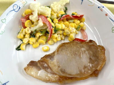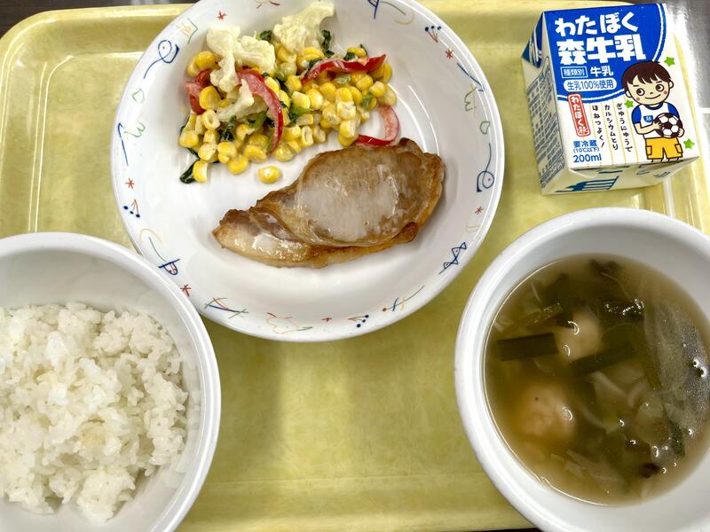 ごはん、牛乳、豚肉のしょうが焼き、えび団子スープ、コーンサラダ