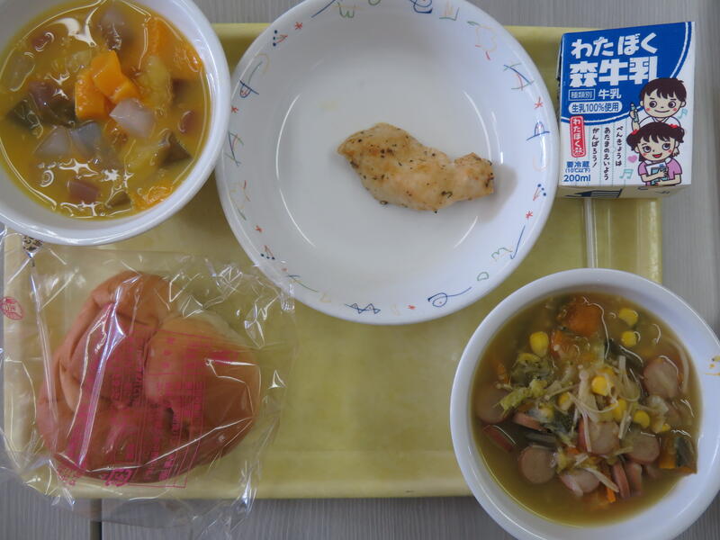 フラワーパン 鶏肉のハーブ焼き 野菜たっぷりスープ フルーツポンチ